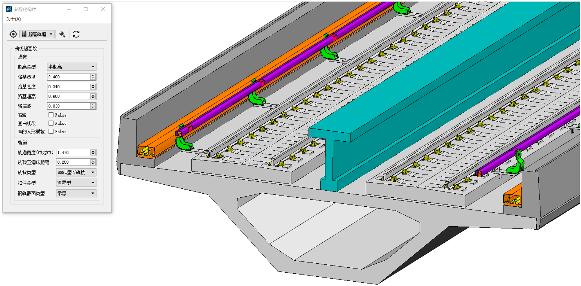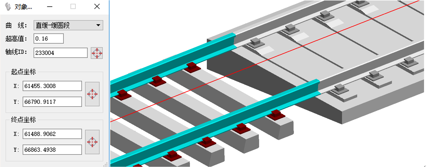 轨道模型的创建可以按照设计意图精确创建,线路超高的旋转方式分为全超高和半超高,输入指定的起始和结束里程,按照线路的平曲线、纵断面、曲线要素以及超高数据创建参数化轨道模型;
