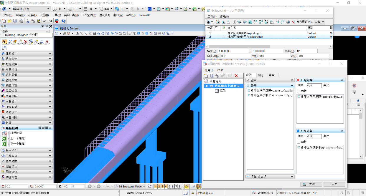 碰撞检测即打开碰撞检测工具,建立所需检测对象的任务,然后将检测的各构件类型所在的图层或参考文件拖入AB两组对象中,设置间隙范围,处理生成结果。由BIM 系统自动完成,即时列出检测报告,避免人工检查遗漏,相对于传统的CAD手段,具有更高的效率和精确度。